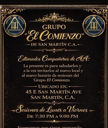 Únase a nosotros en Hollister, CA, para nuestras reuniones de Alcohólicos Anónimos en español centradas en el programa de recuperación de 12 pasos. Todos son bienvenidos.